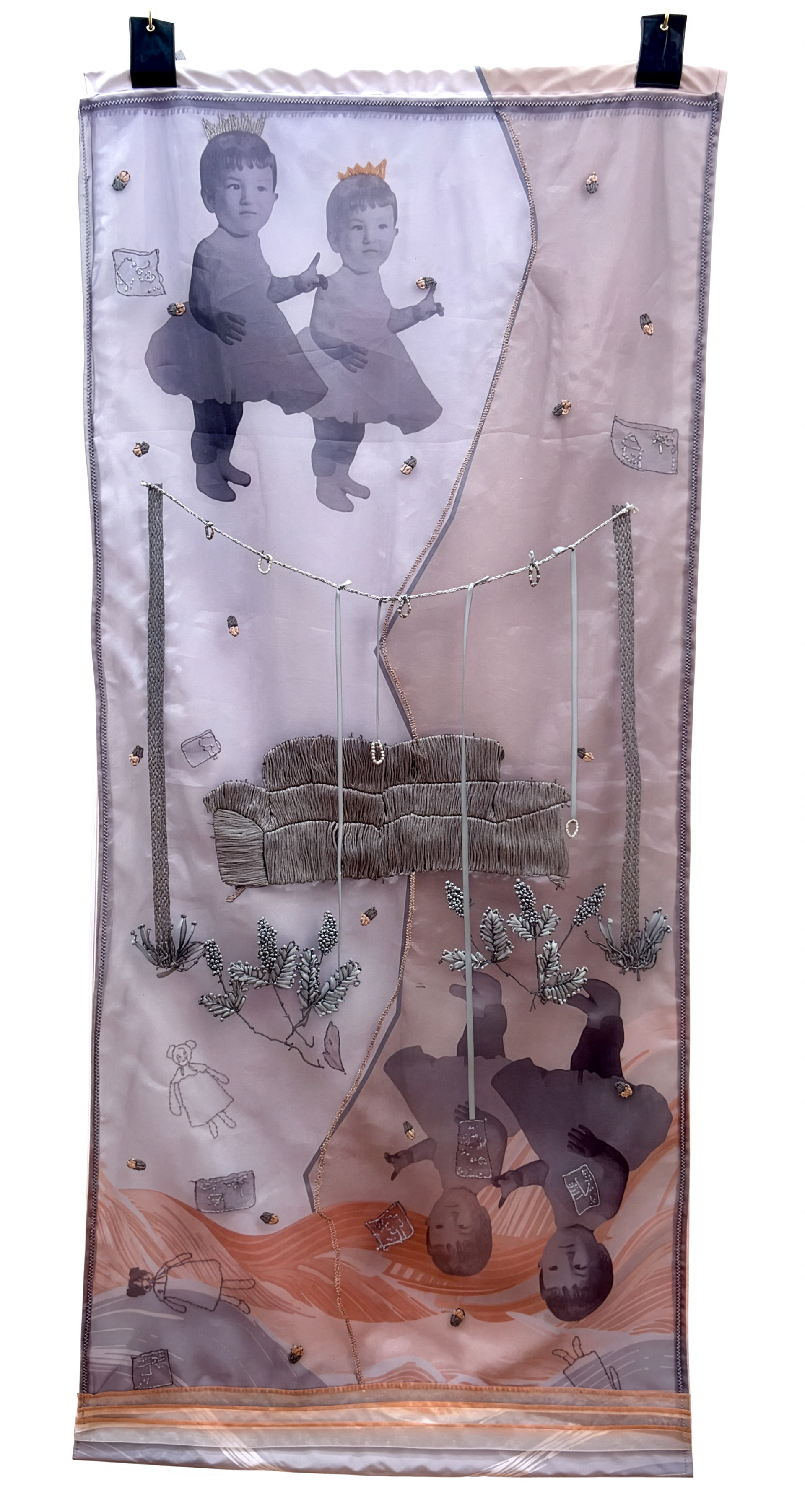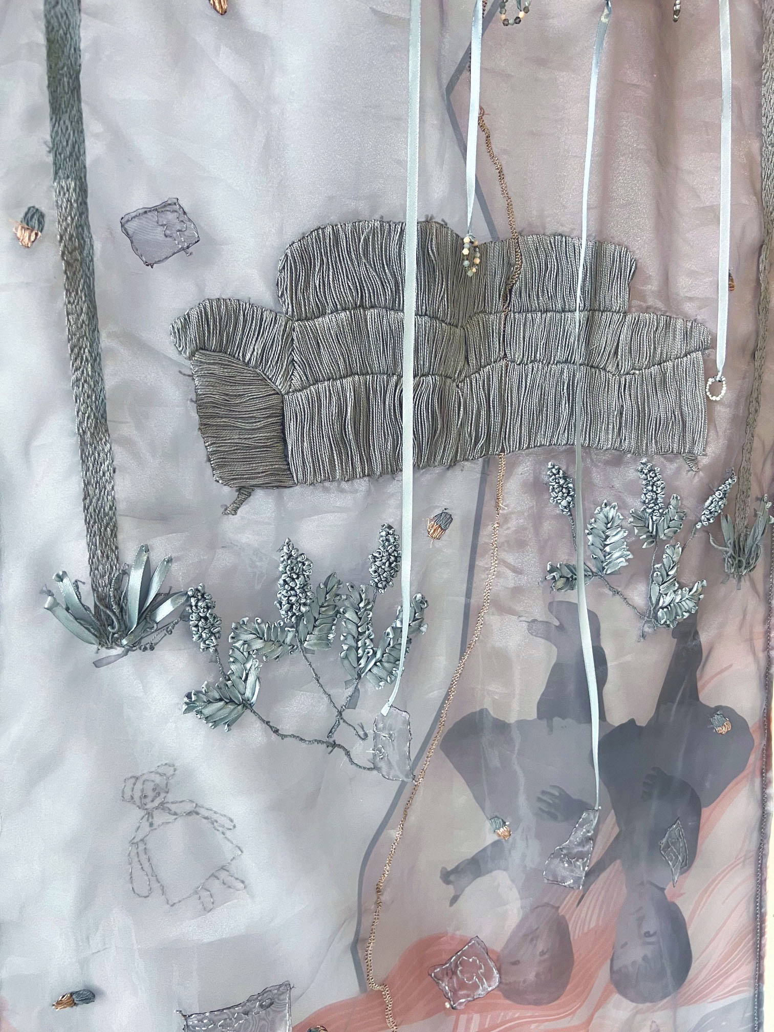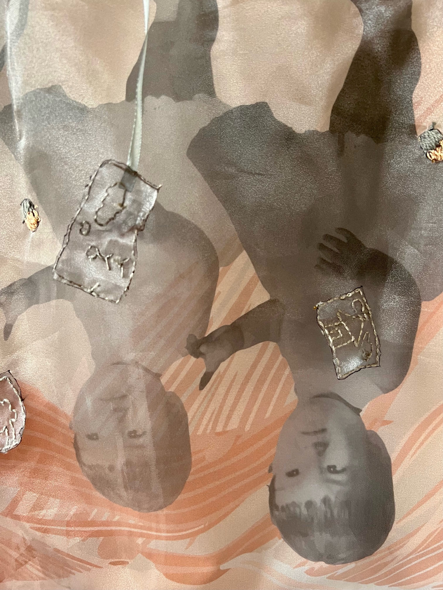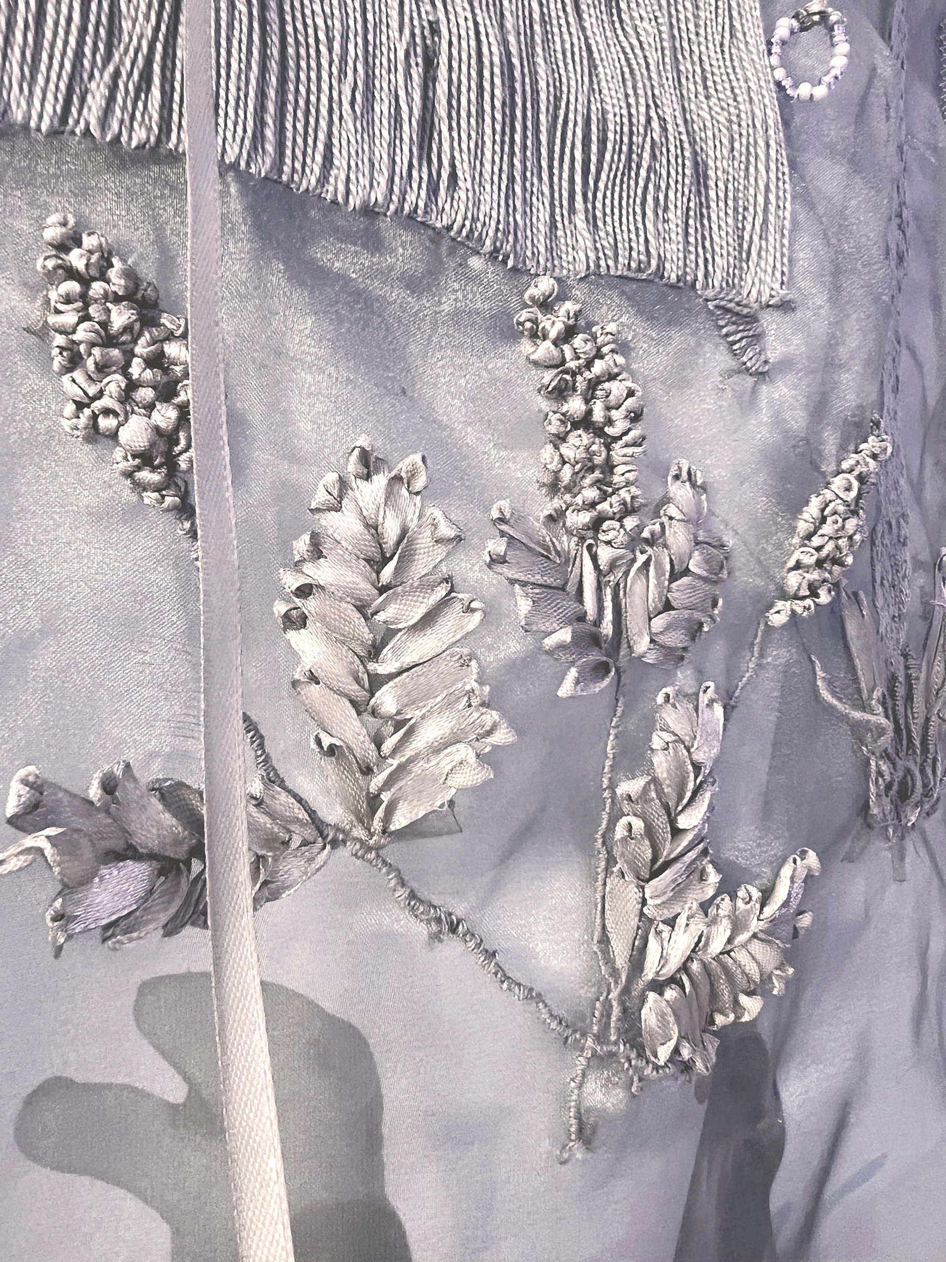 Poliéster impreso, organza, cinta de seda, hilo de algodón egipcio y cuentas de cristal.