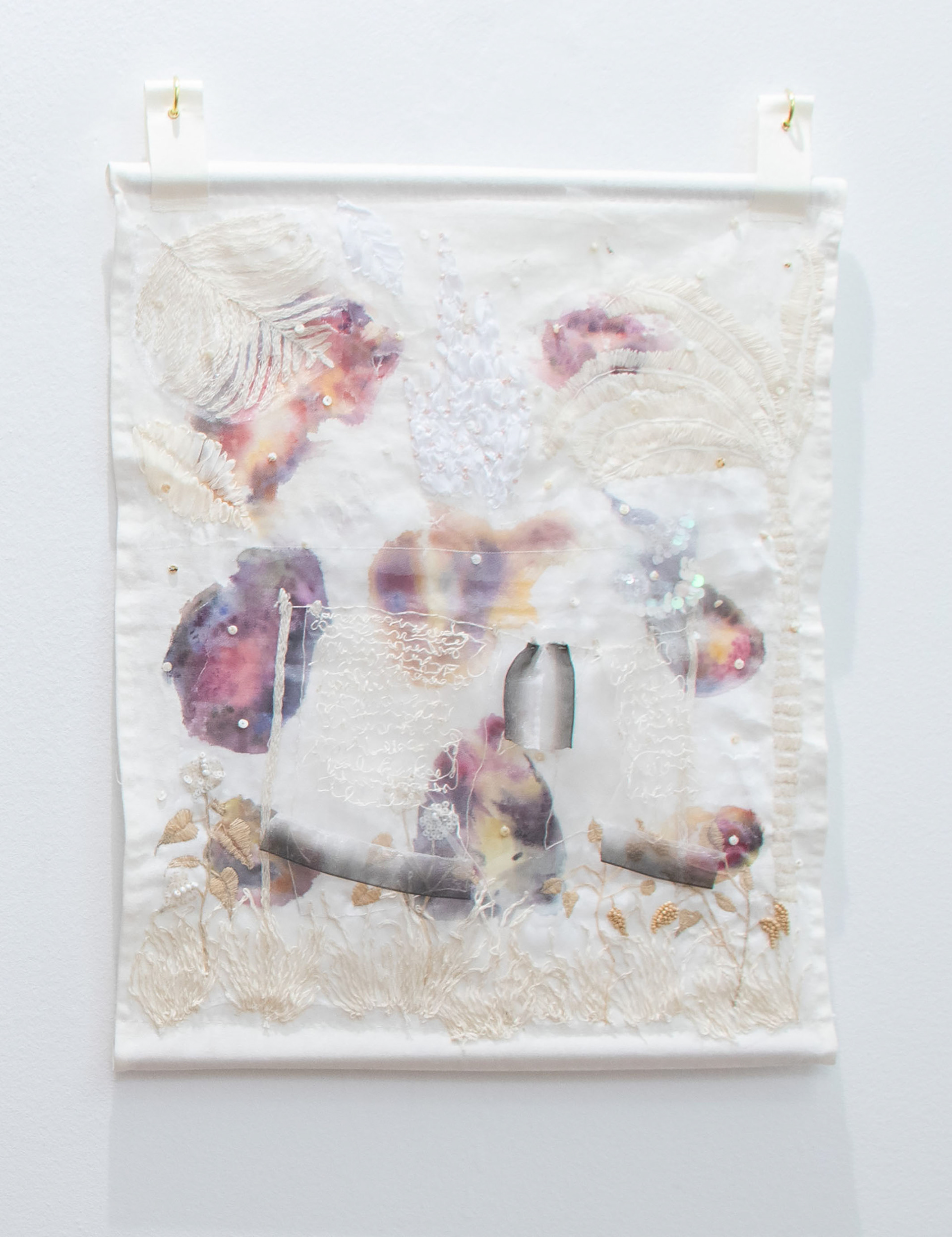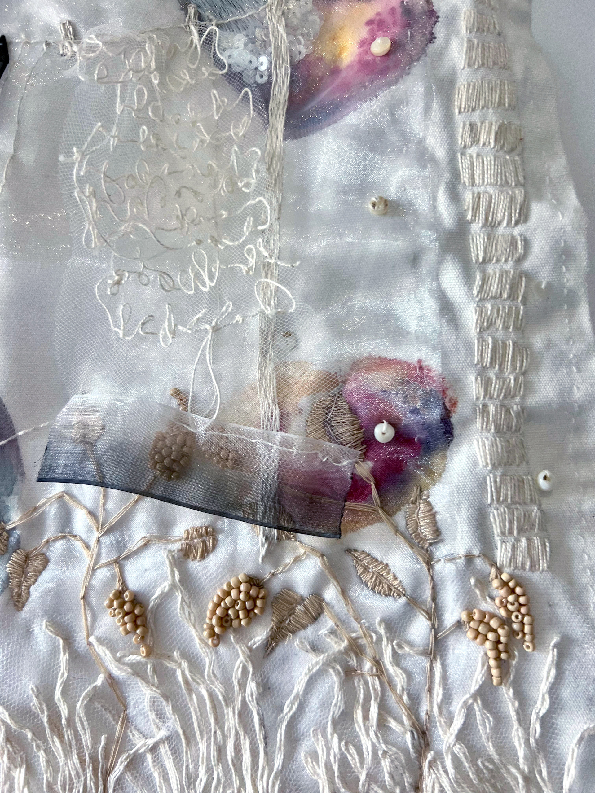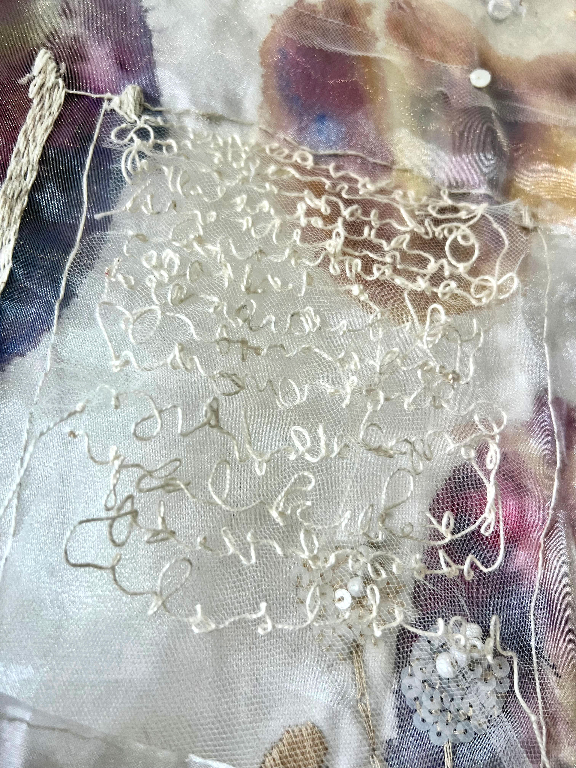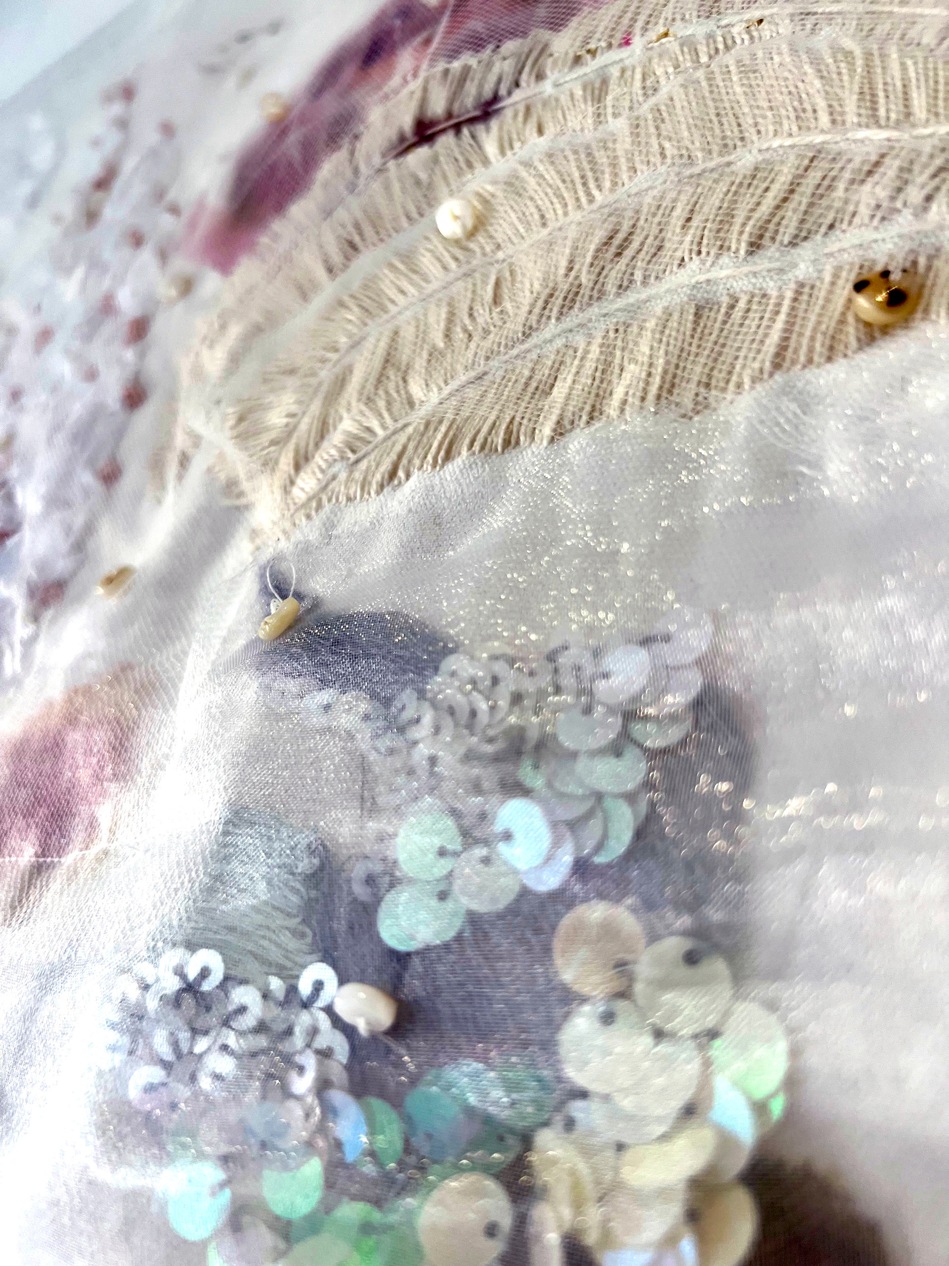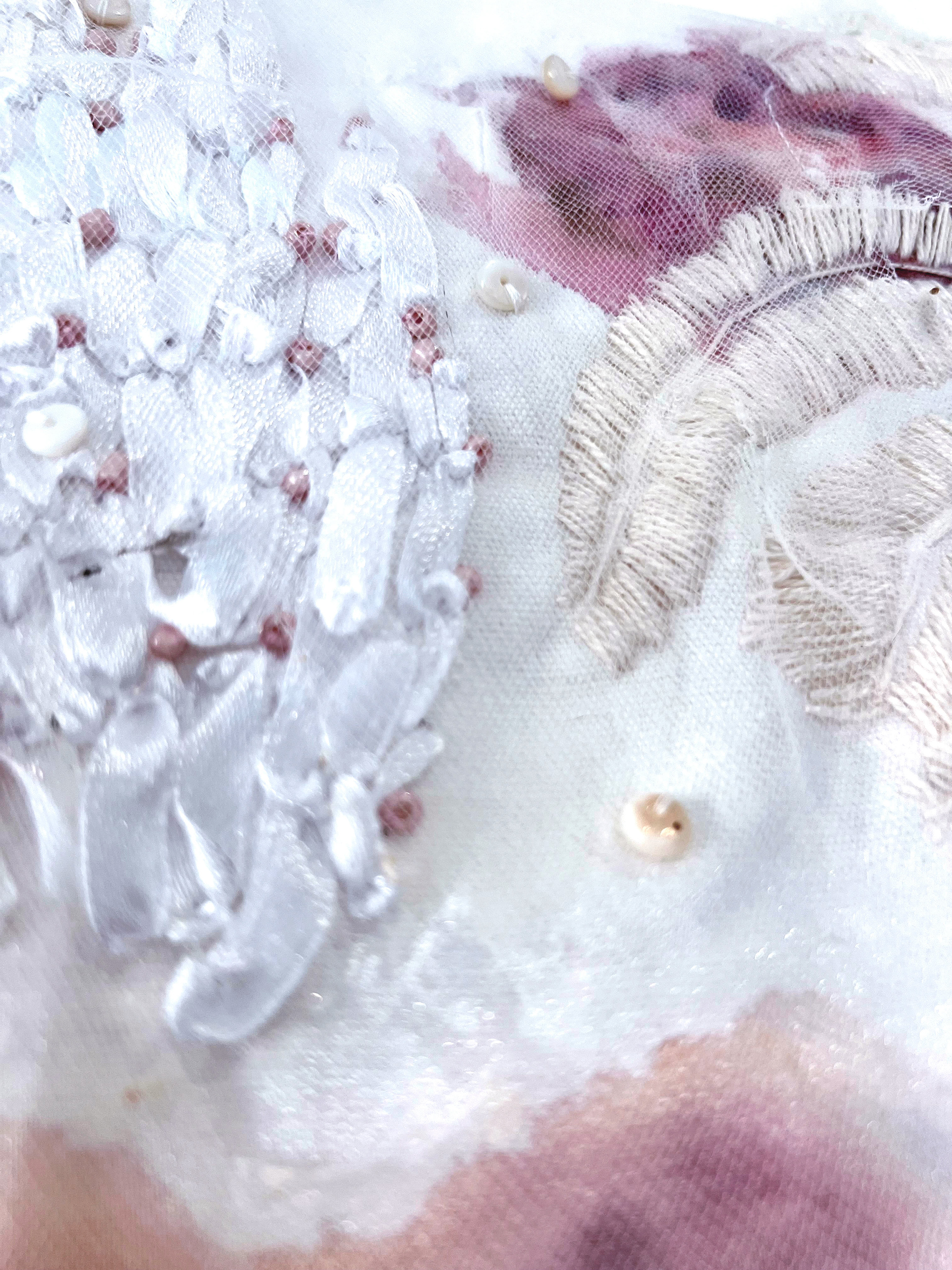 Algodón, organza, tul, pintura textil, cuentas de cristal e hilos.