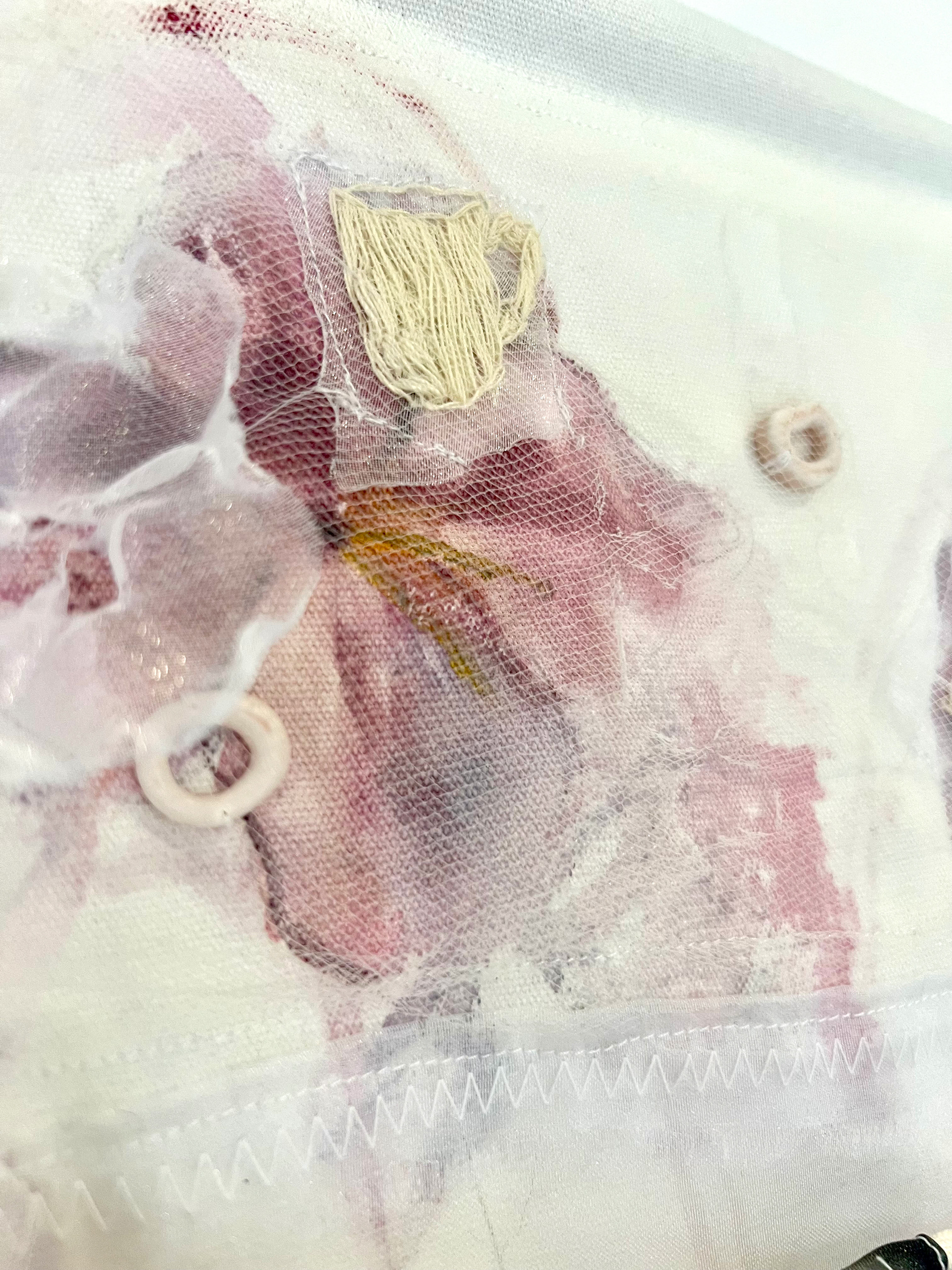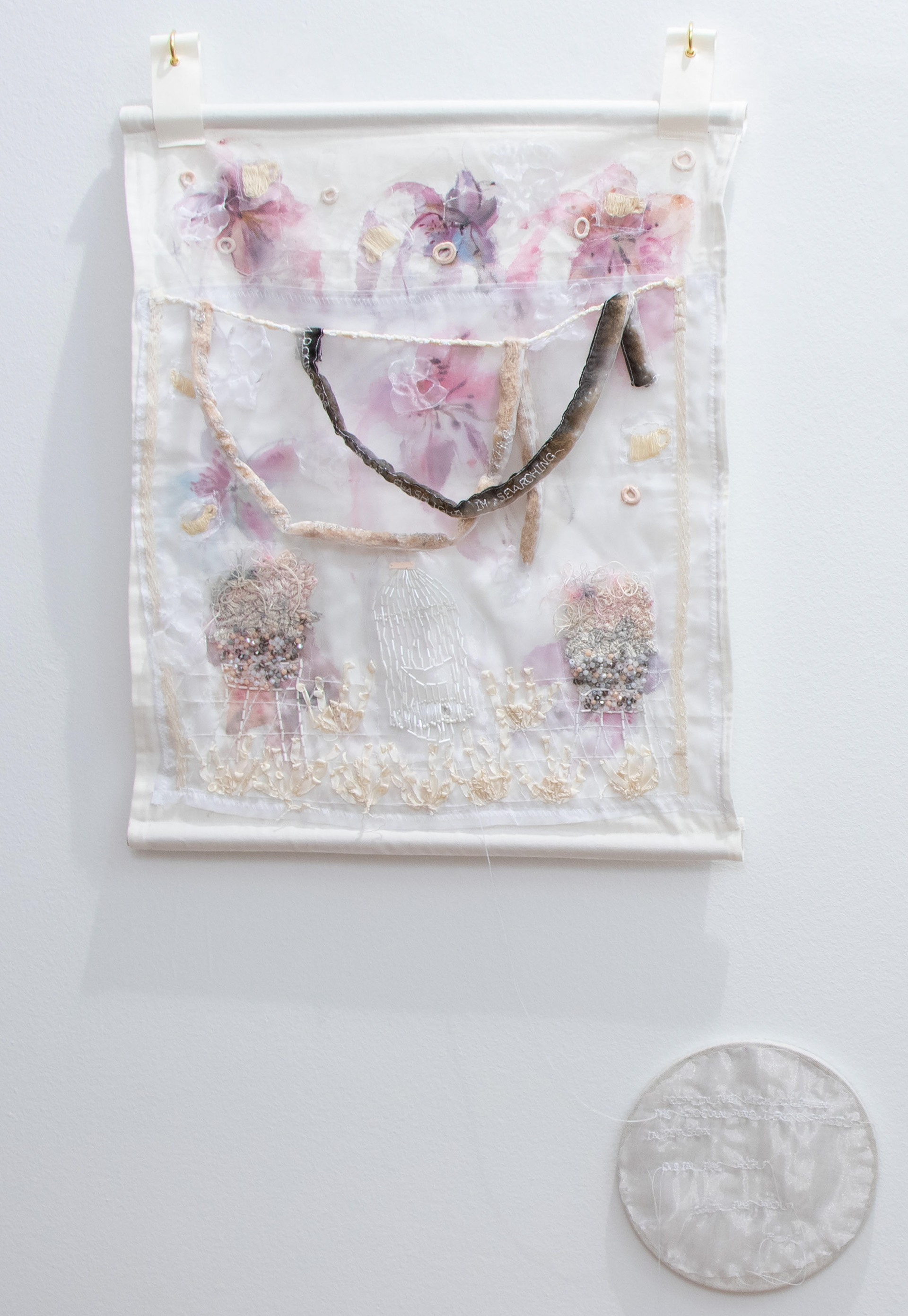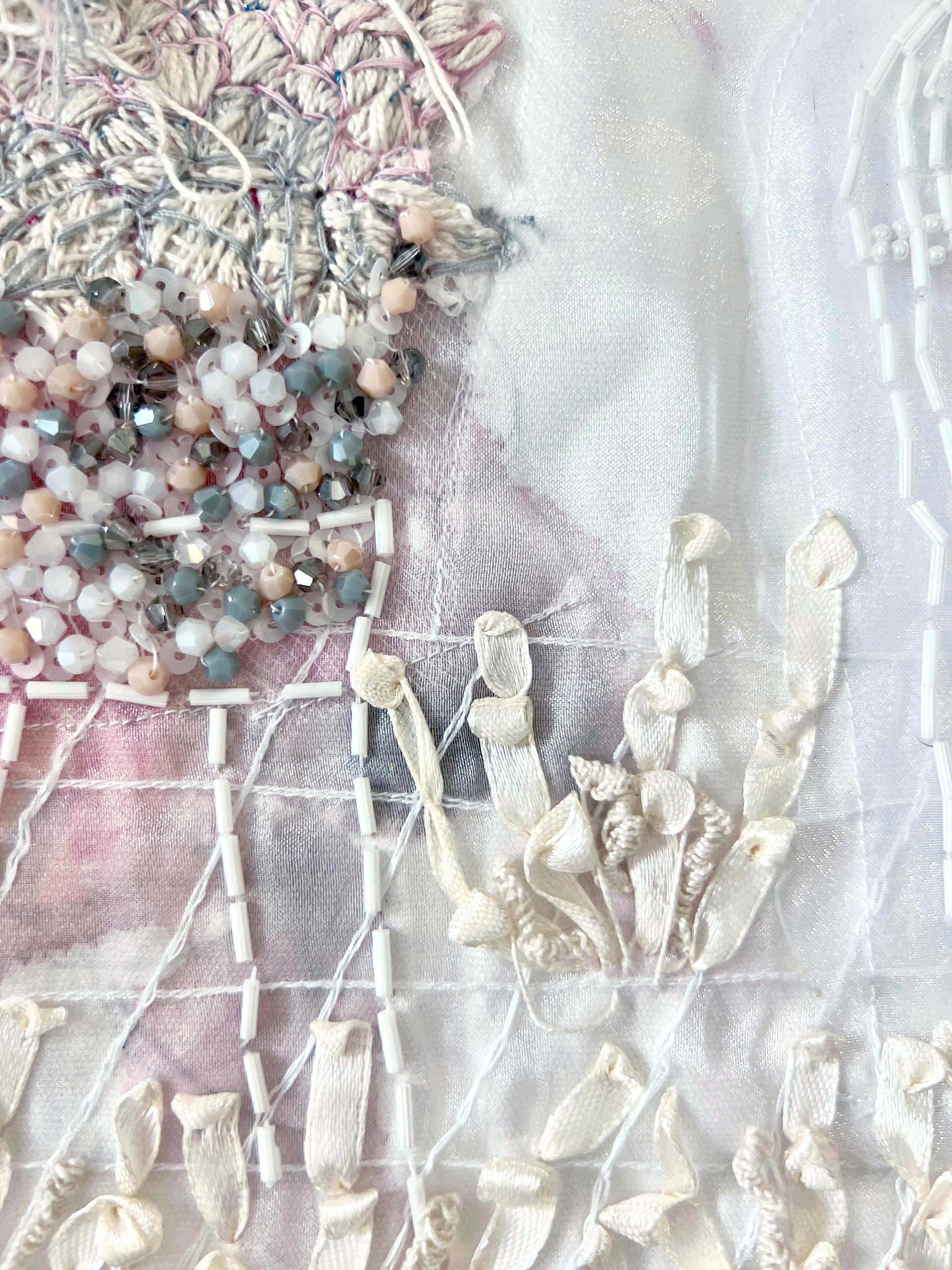 Algodón, pintura textil, cuentas de cristal, cinta de seda, hilos, flores preservadas y arcilla polimérica.