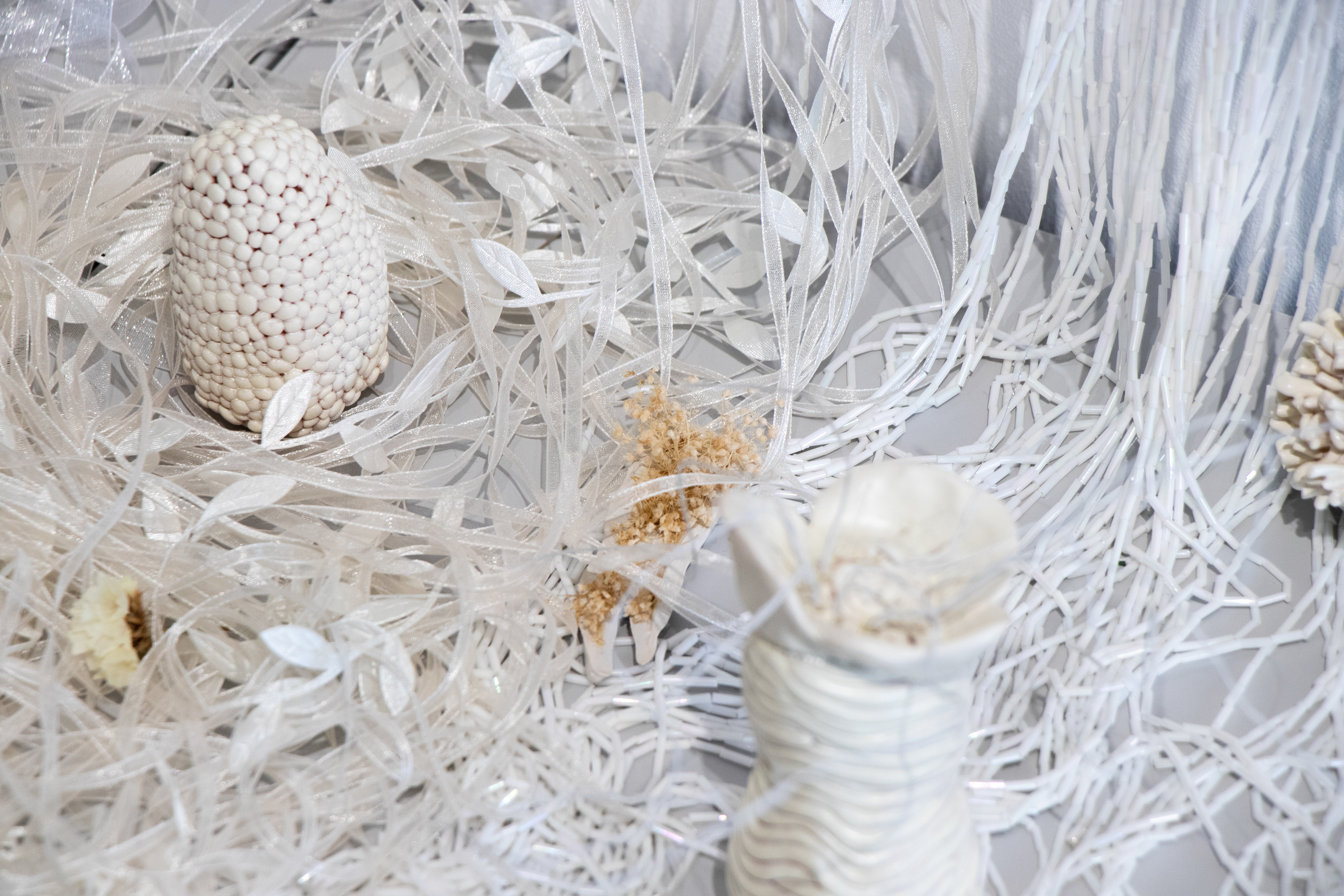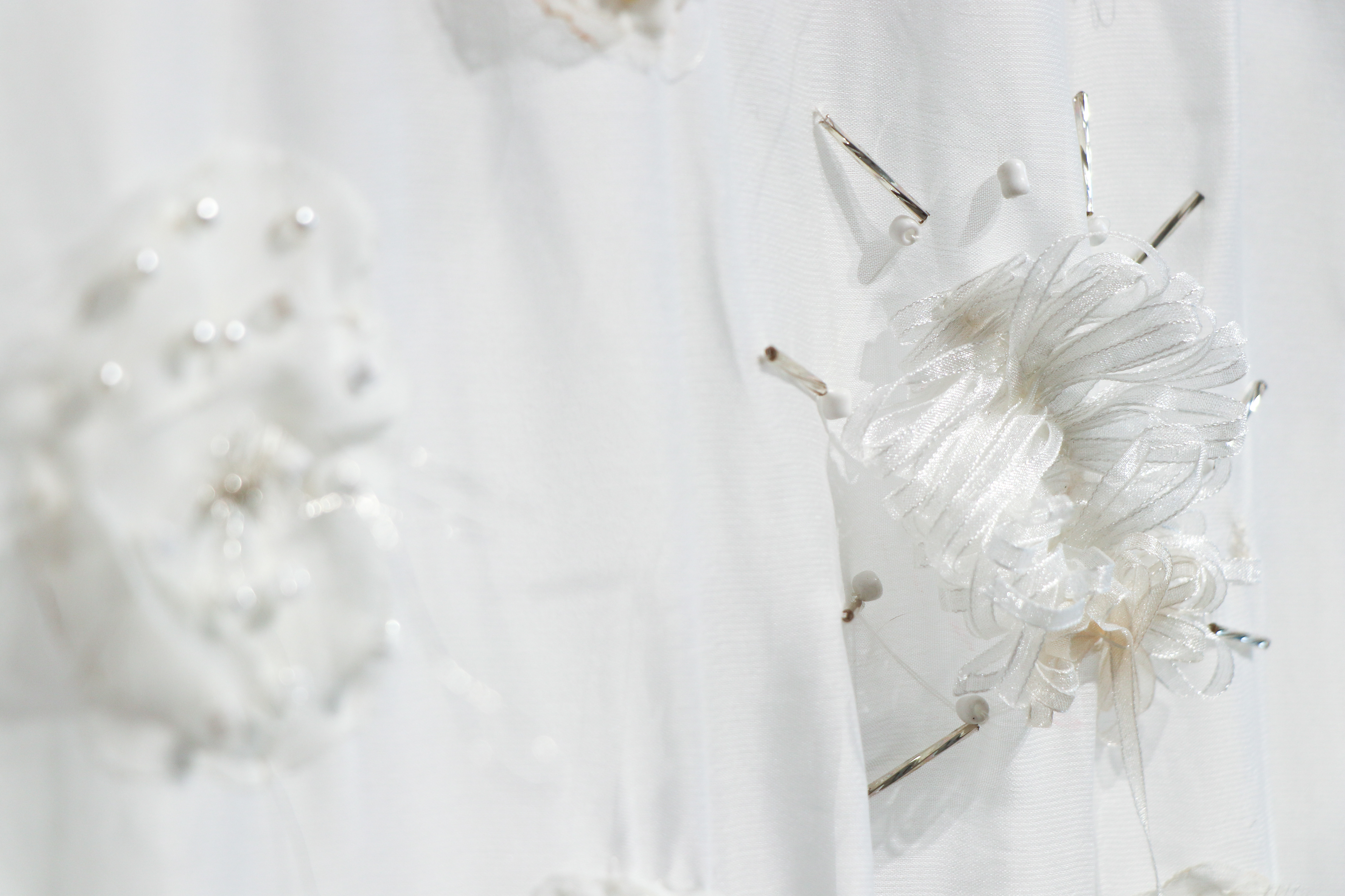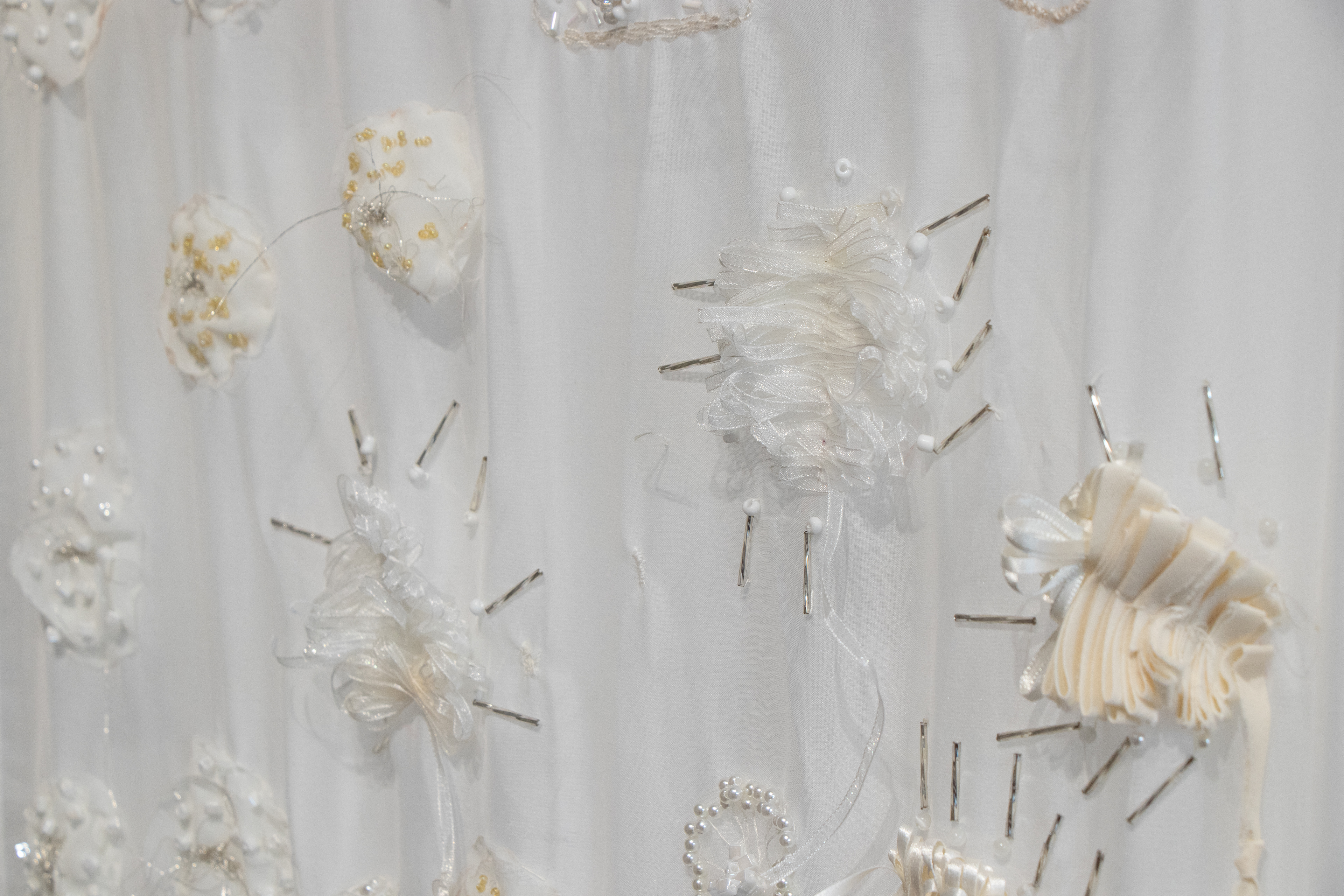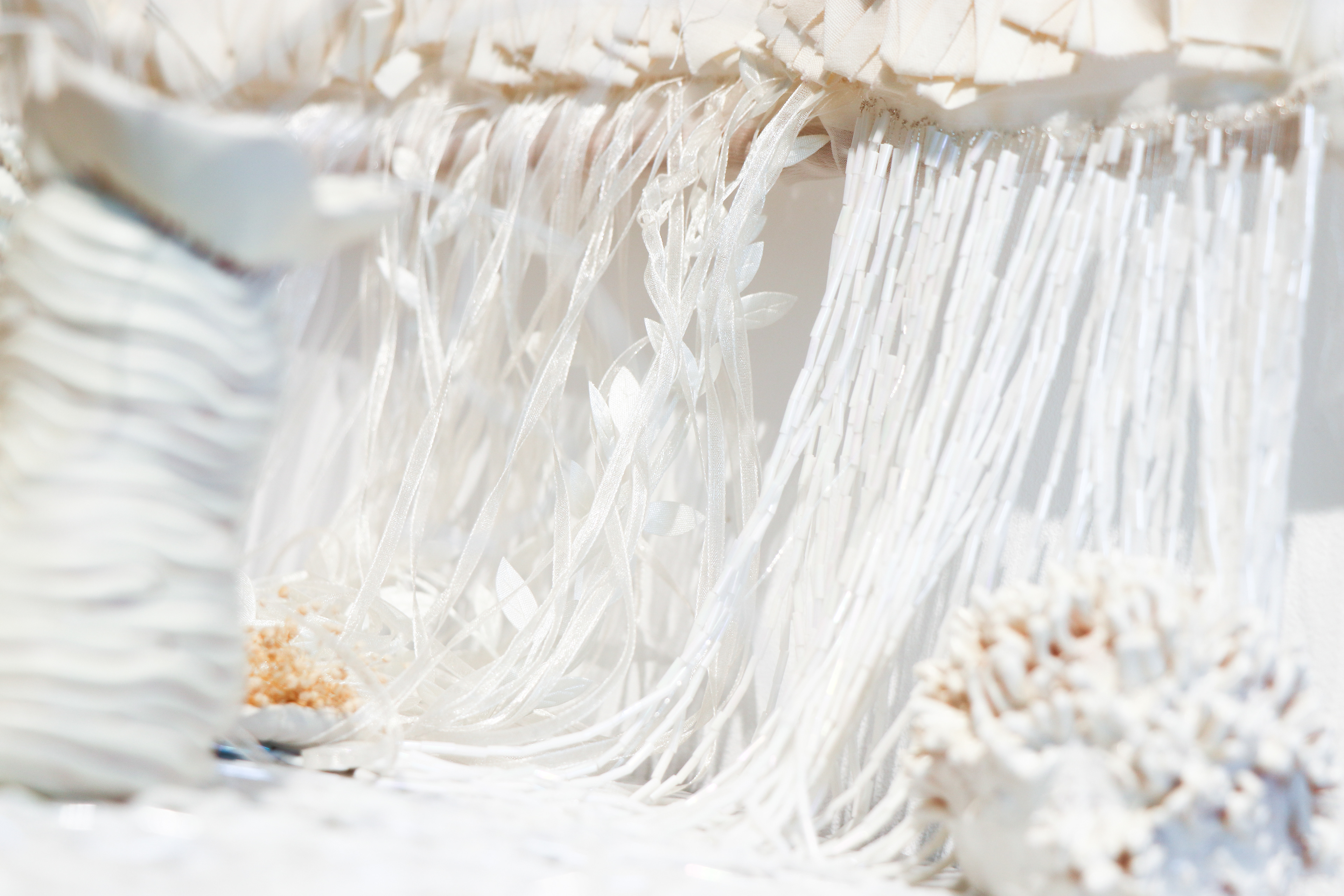 Poliéster impreso, organza, cintas, hilos, cuentas cristal, piedras semipreciosas y arcilla polimérica.