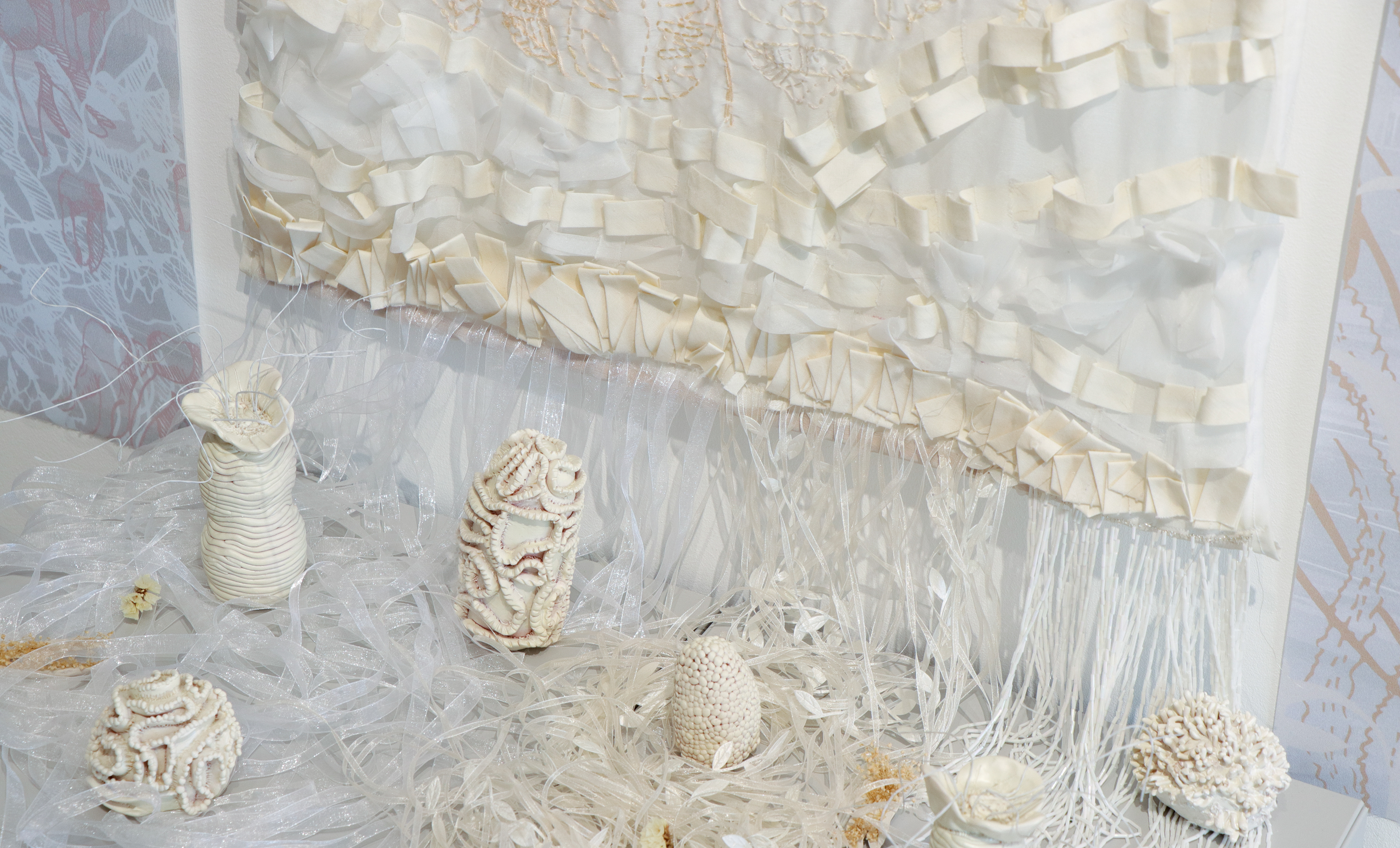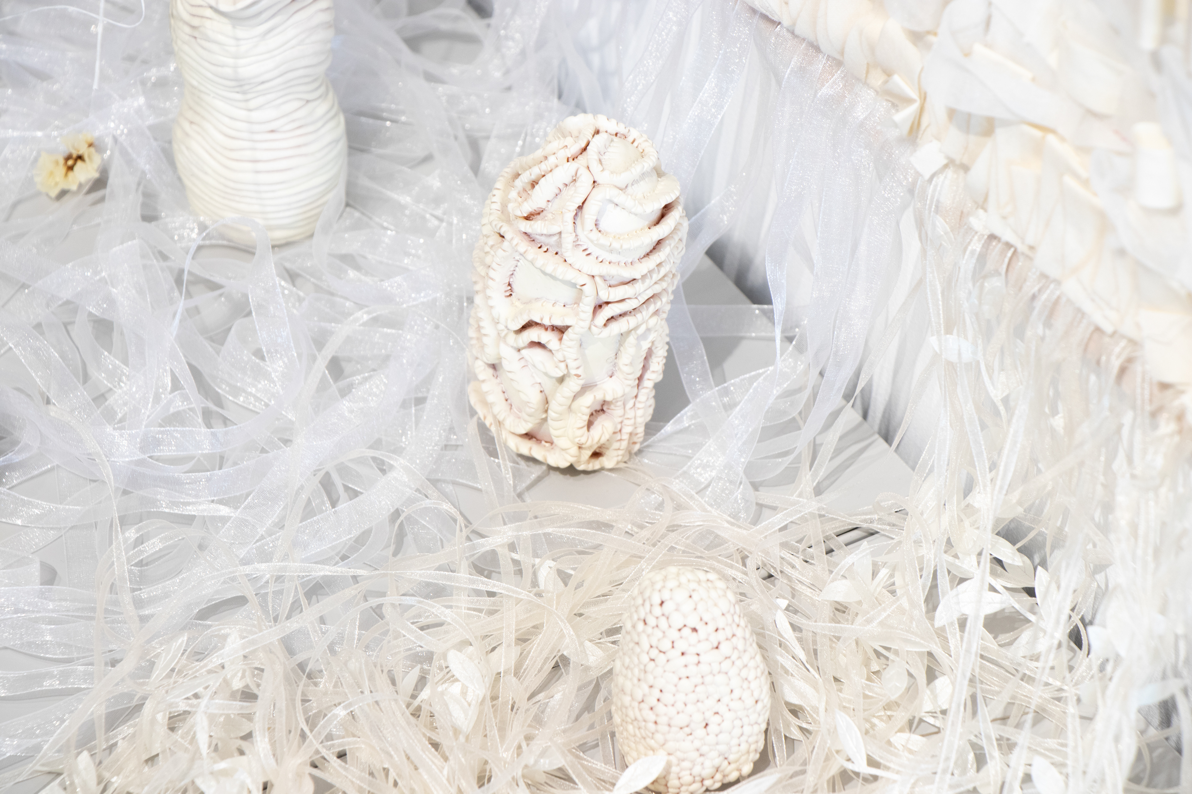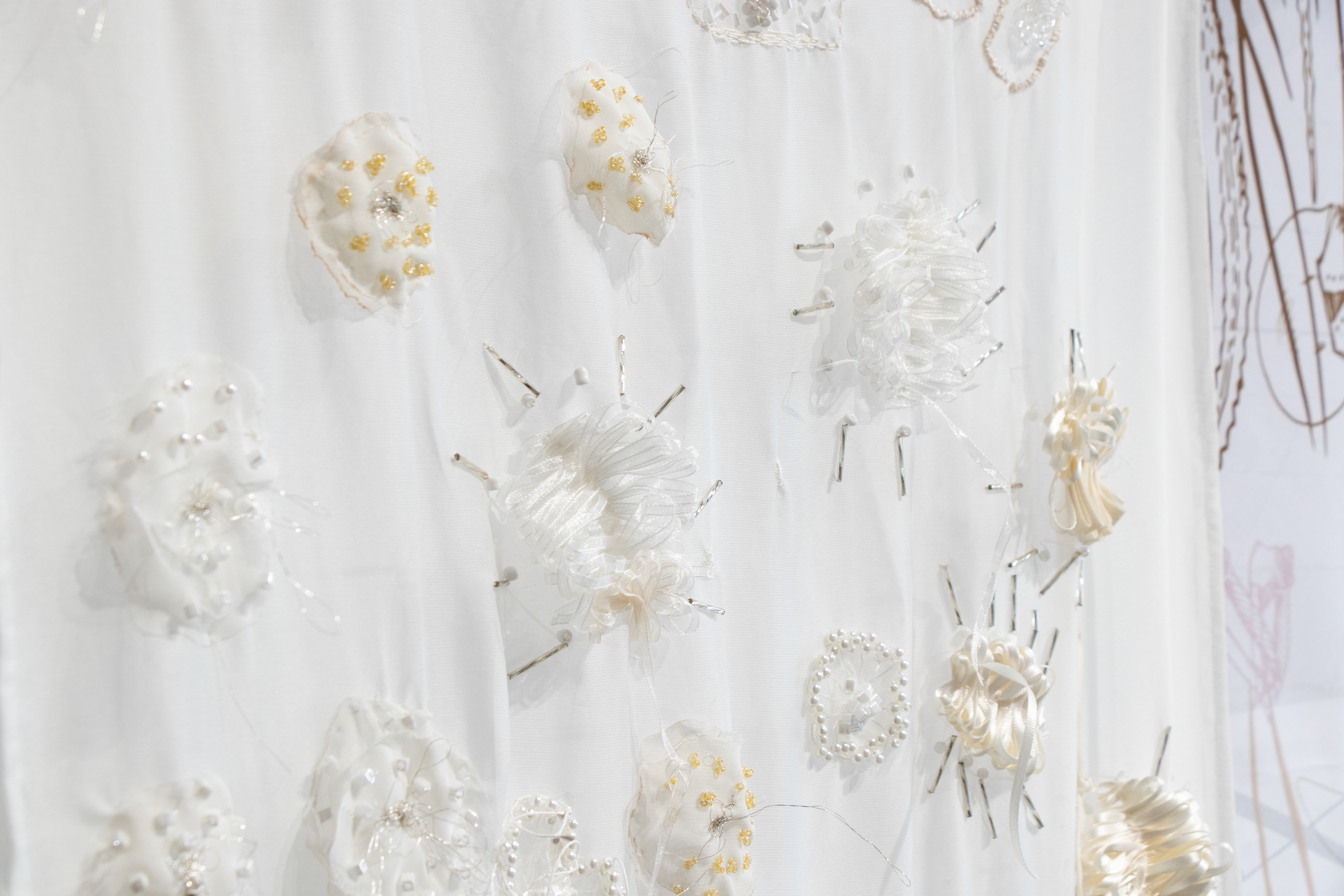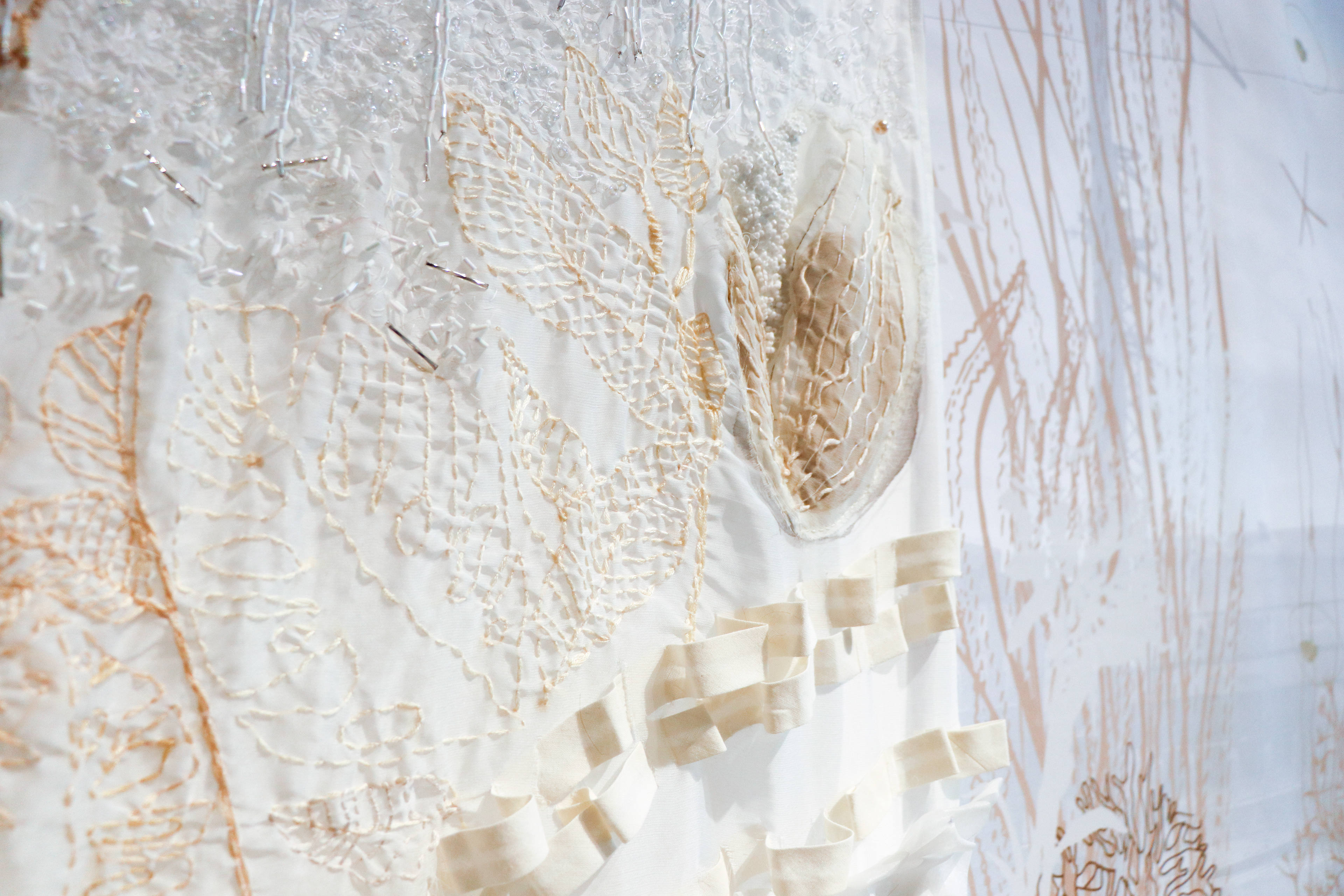 Poliéster impreso, organza, cintas, hilos, cuentas cristal, piedras semipreciosas y arcilla polimérica.