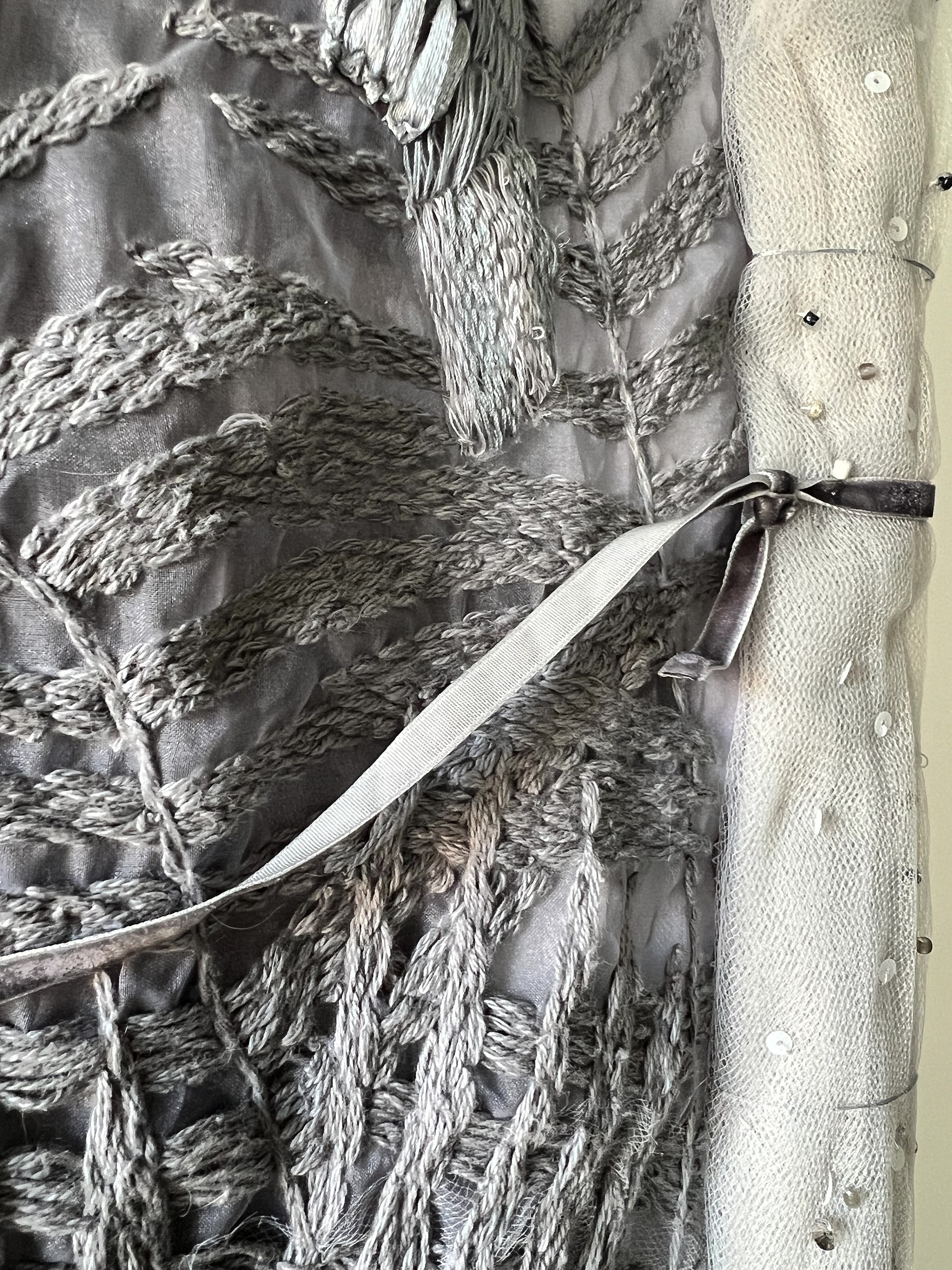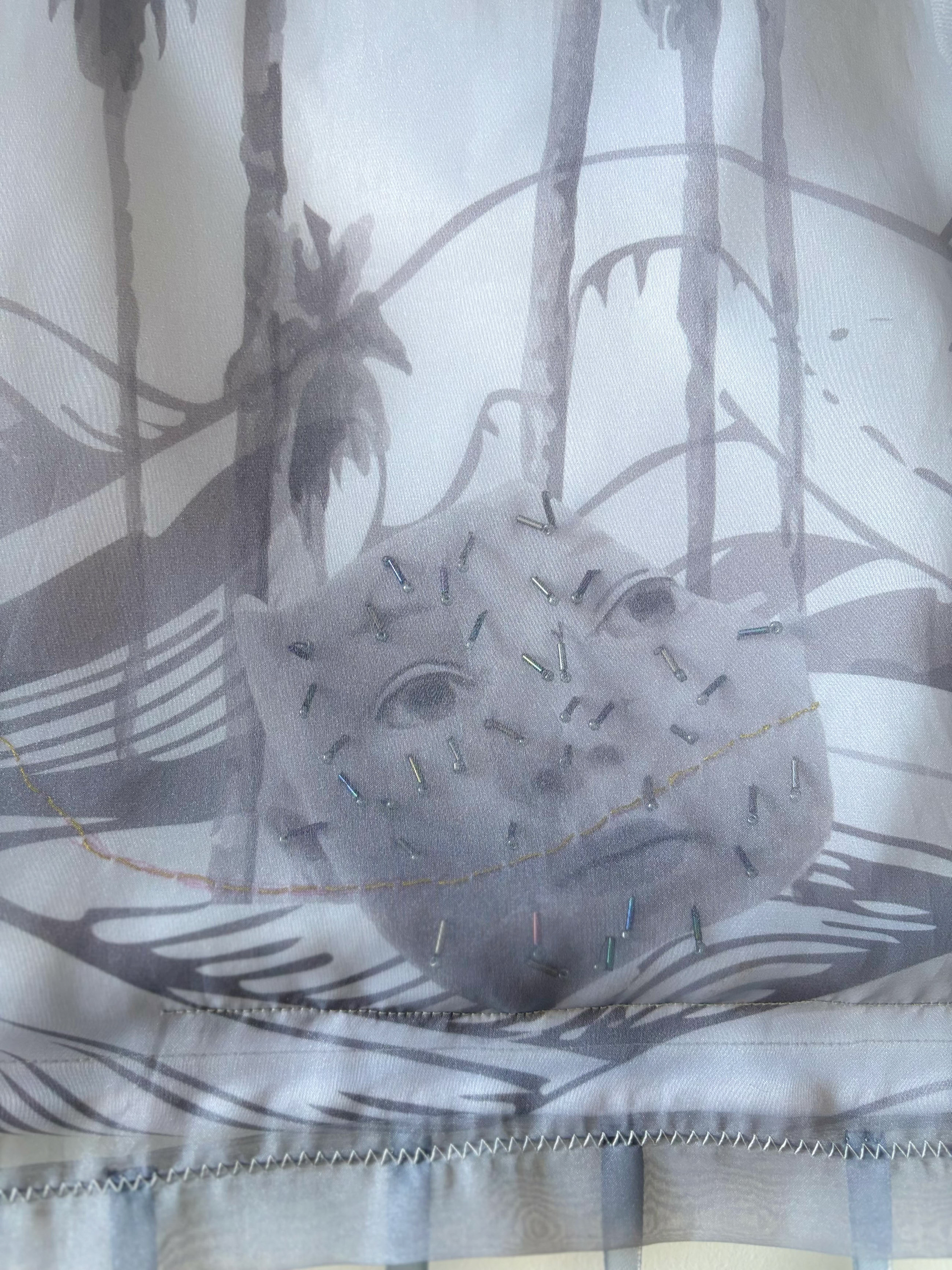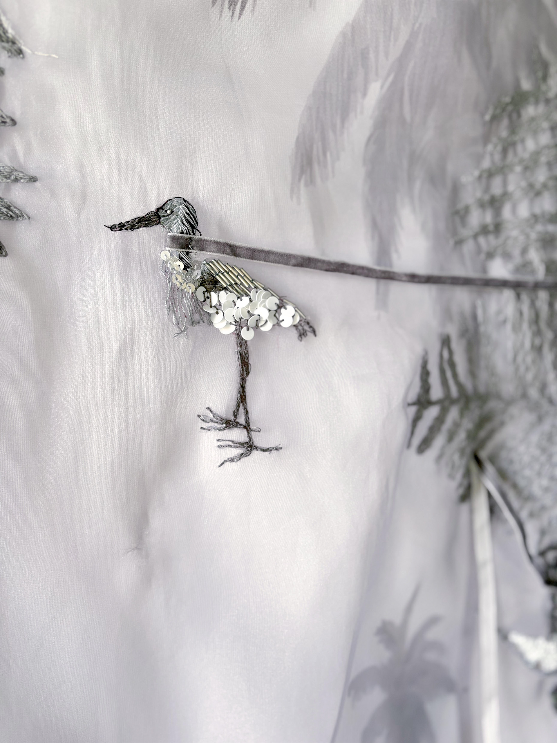 Poliéster impreso, gasa, tul, cuentas de cristal, cinta de seda, terciopelo y hilo.