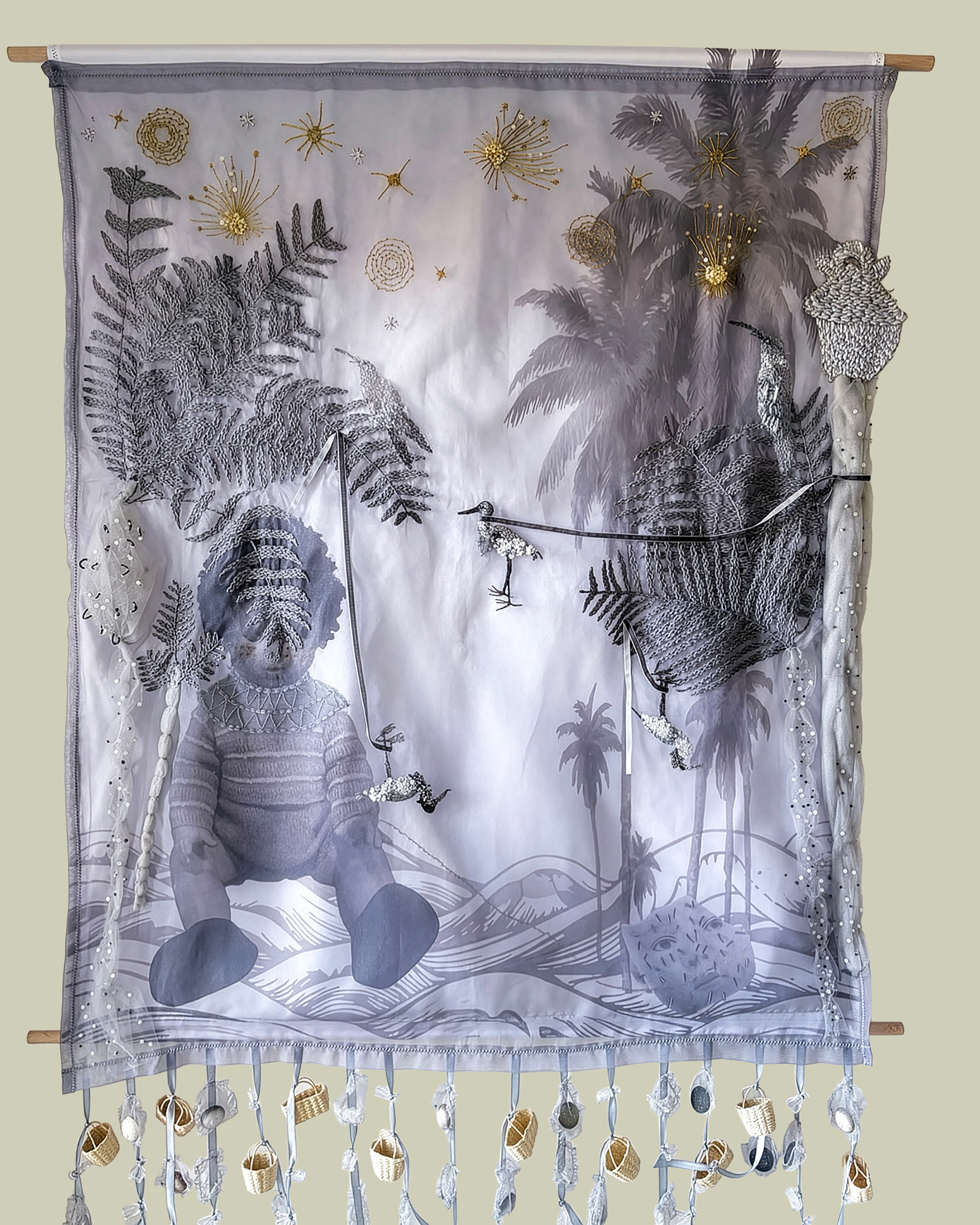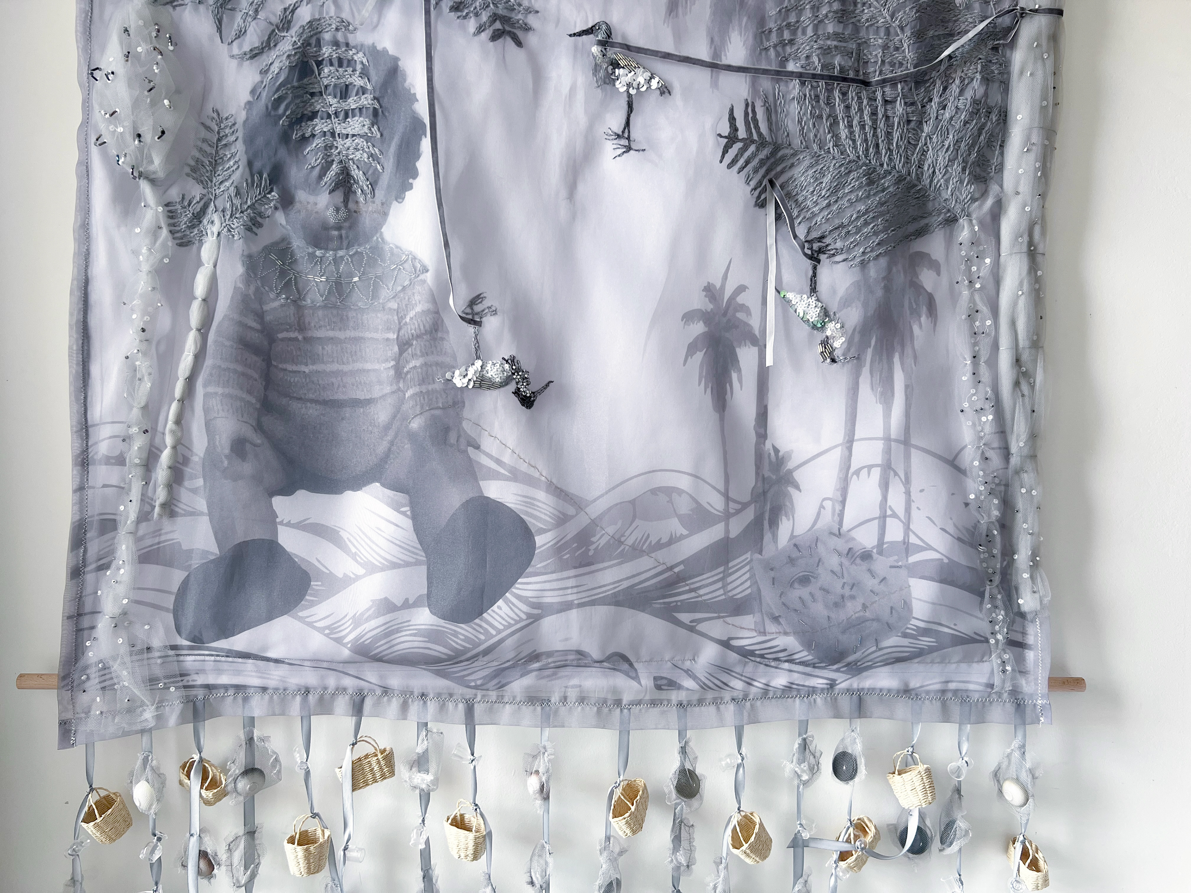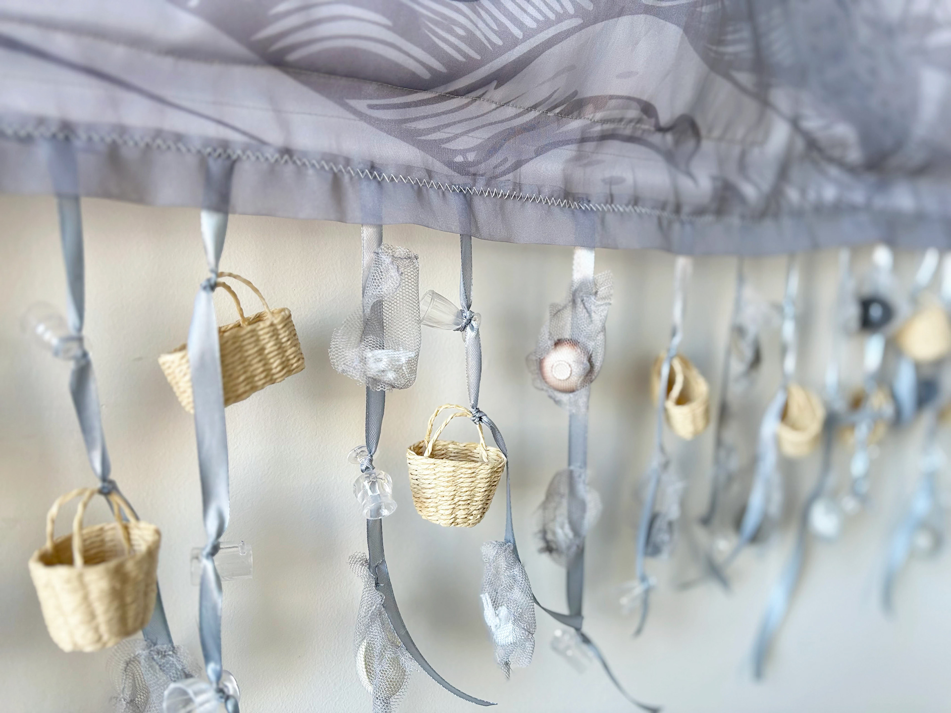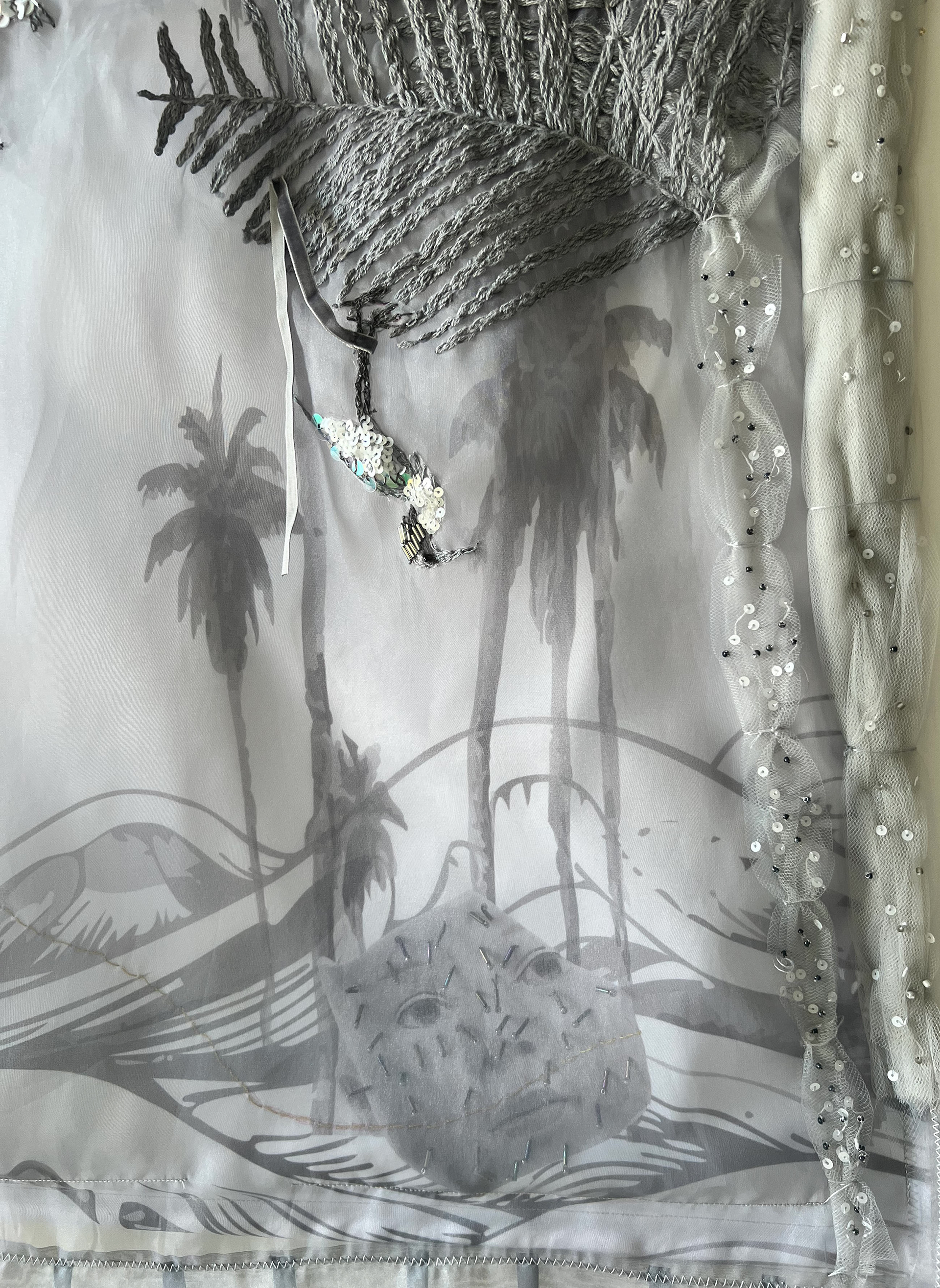 Poliéster impreso, gasa, tul, cuentas de cristal, cinta de seda, terciopelo y hilo.