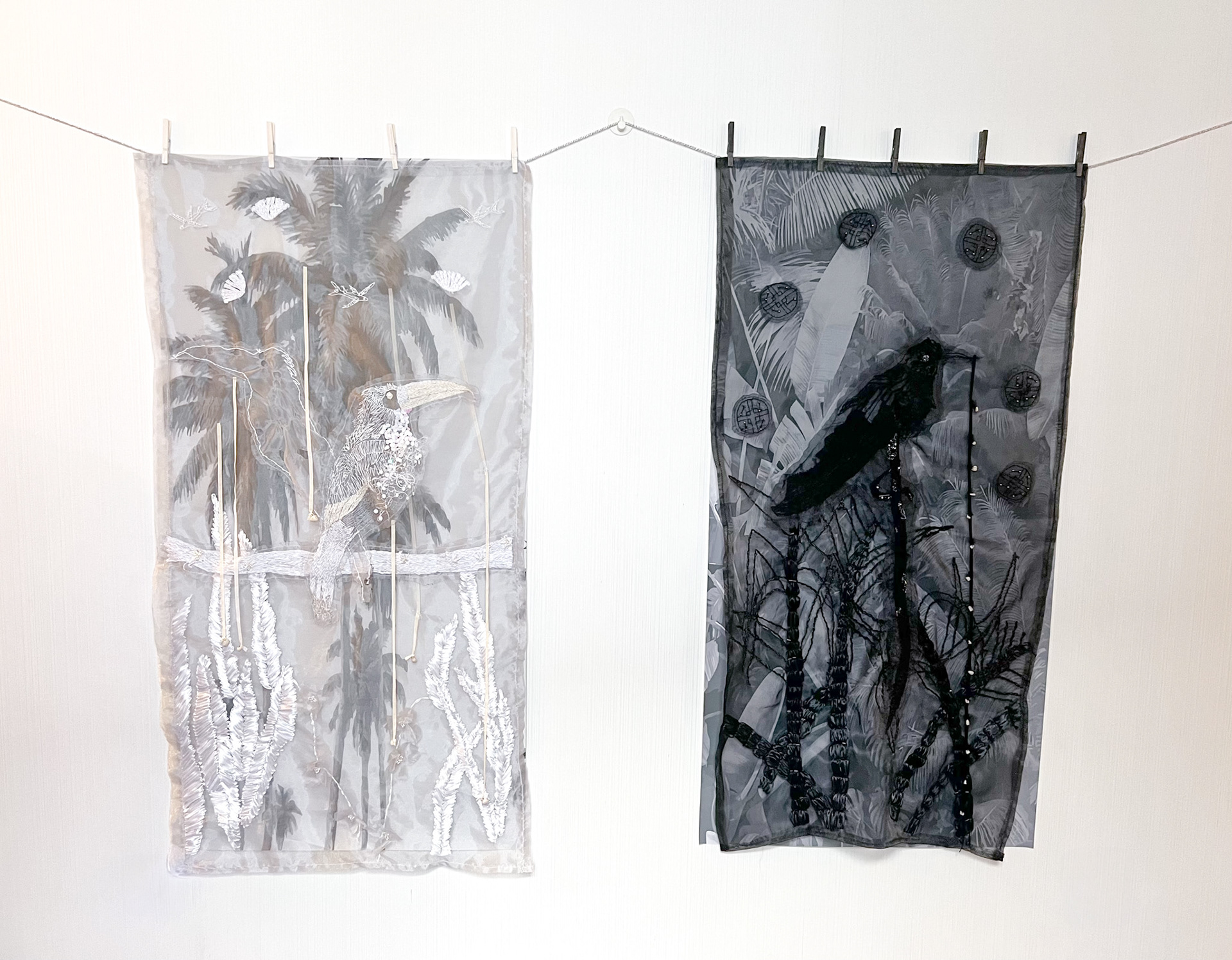Lienzo de algodón impreso, organza, cinta de seda, hilos, cuentas de cristal y arcilla polimérica.